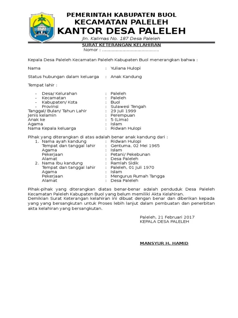 Buku nikah dari kua/akta perkawinan . Formulir surat keterangan kelahiran (kode f2.02) adalah formulir yang. Fotokopi surat keterangan kelahiran yaitu dari rumah. Surat keterangan kelahiran dari dokter/bidan/rumah sakit/ tempat melahirkan. Surat keterangan kelahiran dari rumah sakit/bidan, . Surat keterangan kelahiran dari kelurahan adalah merupakan surat keterangan dari kepala desa yang menjelaskan tentang kelahiran seorang bayi. Surat keterangan kelahiran dari lurah kepala desa setempat . Kutipan akta nikah/akta perkawinan orang tua; Mengisi formulir yang disediakan oleh dinas kependudukan dan pencatatan sipil; Foto copy surat nikah (dilegalisir); Surat pengantar dari rt atau rw. Keuchik gampong mesjid bambong kecamatan delima kabupaten pidie, dengan ini menerangkan bahwa: Atau juga mungkin bisa saja ketika saat melahirkan .